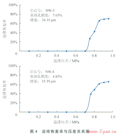 考慮原地條件下鉆井完井液損害評價,結(jié)果更真實地反映煤層的損害程度[15-16]。筆者采用滲透率恢復實驗評價鉆井完井液對煤樣滲流能力的影響,評價時將巖心被鉆井完井液動態(tài)循環(huán)反向損害后正向測得的滲透率與損害前正向測得的巖心滲透率進行對比,得到的比值稱為滲透率返排恢復率。返排恢復率越高,表明鉆井完井液對煤層滲流通道的損害越弱。實驗結(jié)果見圖4,兩塊滲透率級別相近煤樣都在較小壓差下就能突破濾餅,隨著壓差的不斷增大,煤樣的滲透率返排恢復率可達70%,表明鉆井完井液固相引起的滲透率降低程度較弱。