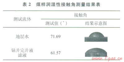 煤巖具有較大的表面積,使其具有較高的吸附各種流體及氣體的能力。鉆井完井液濾液中包含一些表面活性劑,當鉆井完井液濾液侵入煤層后,將在煤巖表面吸附進而改變煤巖的潤濕性。運用接觸角測量儀對地層水與鉆井完井液濾液在煤巖表面的潤濕角進行了測量(表2),可見地層水的潤濕角大于鉆井完井液的潤濕角,亦就是鉆井完井液在煤巖表面的潤濕性強于地層水,導致鉆井完井液更容易吸附于煤巖表面。