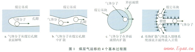 煤層氣的產(chǎn)出可以概括為3個過程:①從吸附態(tài)轉(zhuǎn)變?yōu)橛坞x態(tài)的解吸過程;②在濃度差、壓力差作用下氣體分子的擴散過程;③擴散氣體在煤巖儲層的裂縫系統(tǒng)滲流并最終流入井筒的過程。煤層氣的產(chǎn)出受解吸—擴散—滲流過程的共同控制,3個環(huán)節(jié)緊密相連,相互影響,相互制約,任一過程受制,都將嚴重影響煤層甲烷的產(chǎn)出。筆者結(jié)合鉆井完井液作用對煤層氣運移行為的影響,將煤層氣產(chǎn)出過程劃分為4個基本過程(圖1):①氣體分子從煤巖孔隙表面解吸;②氣體分子在煤巖孔隙中擴散;③氣體分子在界面液膜內(nèi)擴散;④基塊擴散氣體進入裂縫系統(tǒng)滲流并最終流入井筒。由此可見,鉆井完井液與煤層相互接觸后固相和液相的侵入,不僅降低裂縫的滲流能力,而且亦會引起煤巖表面的物理化學作用導致煤層氣的解吸—擴散能力的下降,從而影響煤層氣運移的全過程。