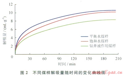 鉆井完井液濾液是一種化學成分比較復雜的流體,包含各種表面活性劑,煤層氣井鉆井過程中鉆井完井液濾液侵入后將與煤層發(fā)生物理化學作用,降低煤巖解吸能力進而影響煤層氣產(chǎn)量,為考察現(xiàn)場用鉆井完井液體系對寧武盆地9號煤層解吸能力的影響,開展了平衡水煤樣、飽和水煤樣和鉆井完井液處理煤樣的解吸實驗。