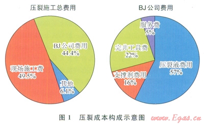 眾所周知,非常規(guī)油氣開發(fā)的經(jīng)濟效益取決于成本的控制,北美取得頁巖氣開發(fā)的成功正是由于采用了低成本的清水壓裂[4]。但以勝利油田某非常規(guī)頁巖油氣井的壓裂開采預(yù)算為例(圖1),不難看出,國外公司的完井工具、壓裂材料(壓裂液和支撐劑)以及技術(shù)服務(wù)費用占據(jù)全部壓裂費用的44.4%,其中,壓裂液的費用又占BJ公司全部預(yù)算的57%。兇此,目前的非常規(guī)油氣開發(fā)模式難以取得經(jīng)濟效益,從長遠角度出發(fā),必須要有大量的資金和科研力量投入到非常規(guī)油氣開采的基礎(chǔ)研究上,從完井工具、壓裂液和支撐劑以及相關(guān)技術(shù)上打破國外技術(shù)壟斷。提升壓裂開采的軟件實力,才能有效控制開發(fā)成本,取得并提高經(jīng)濟效益。