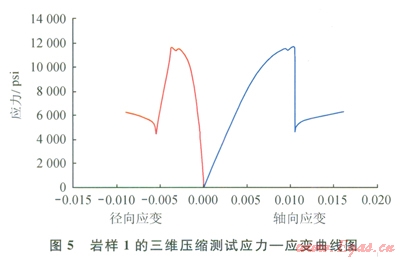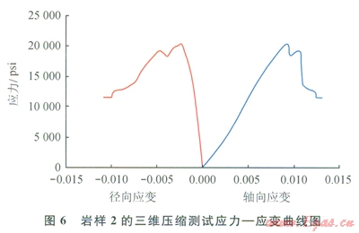 三維壓縮實(shí)驗(yàn)應(yīng)力  應(yīng)變曲線如圖5、6所示。巖石材料的塑性與脆性可根據(jù)應(yīng)力、應(yīng)變曲線上負(fù)坡的坡降大小來劃分。負(fù)坡較陡者為脆性,反之為塑性。由圖5、6可知:巖樣1和巖樣2在應(yīng)力分別為l2000psi(1psi6.895kPa)20000psi時(shí),應(yīng)變?yōu)?span lang="EN-US">0.010.009時(shí)破碎,屬于脆性巖石,且?guī)r樣2應(yīng)力、應(yīng)變曲線上的負(fù)坡較陡,故其脆性優(yōu)于巖樣1