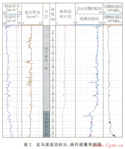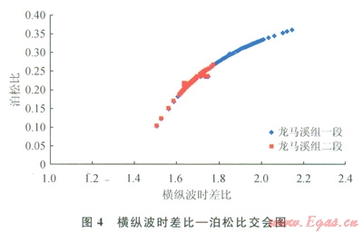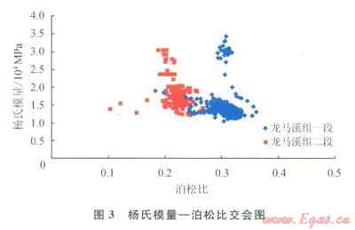 整體龍馬溪組楊氏模量介于l×1043.5×104MPa,平均為2.3×104MPa;泊松比介于0.10.37,平均為0.24。通過圖3可以看出,龍馬溪組一段楊氏模量平均值為1.4×104MPa,泊松比平均值為0.3;龍馬溪組二段楊氏模量平均值為l.8×104MPa,泊松比平均值為0.23。龍馬溪組二段較龍馬溪組一段具有低泊松比,高楊氏模量,說明其脆性優(yōu)于一段。圖4為橫縱波時(shí)差比和泊松比的交會(huì)圖,可以看出龍馬溪組二段的橫縱波時(shí)差比明顯低于一段,說明低橫縱波時(shí)差比參數(shù)用于表征頁巖的脆性程度是有效的。