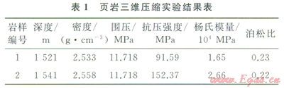 通過巖石力學(xué)實(shí)驗(yàn),龍馬溪組二段頁巖儲(chǔ)層基質(zhì)巖石,抗壓強(qiáng)度分布在91152MPa,平均抗壓強(qiáng)度為121.98MPa,平均楊氏模量為2.15×104MPa,平均泊松比為0.23(1)。測試數(shù)據(jù)分析結(jié)果可知,巖樣2對(duì)比巖樣l具有低泊松比和高楊氏模量的特征,說明龍馬溪組二段在深度1541m時(shí),頁巖脆性程度最優(yōu),與先前的礦物分析和脆性指數(shù)得到的結(jié)論相符。