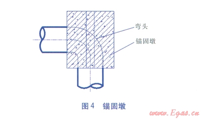 c.無(wú)論按照上述a或b哪種情況處理后,都還需要根據(jù)坡長(zhǎng)及管徑設(shè)置錨固墩(見(jiàn)圖4),一般坡長(zhǎng)>25m時(shí),坡腳用素混凝土或灰土墩將彎頭錨固,坡長(zhǎng)>35m時(shí),除下部彎頭錨固以外,陡坡上每隔15~20m采用錨桿固定,錨桿深度應(yīng)在原土或基巖中。