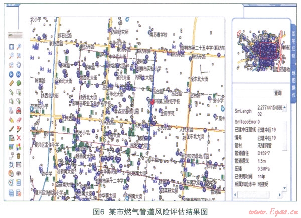 (4)實現(xiàn)燃氣管道風險水平的可視化。首先得到該市的燃氣管道的柵格圖像,經轉換成矢量數(shù)據(jù)并作適當處理后存入supermap deskpro。將燃氣管道的基本信息及風險水平等相關數(shù)據(jù)導入supermap deskpro,再使用supermap is.net將相關數(shù)據(jù)顯示出來,可以使用查詢條件查詢燃氣管道的基本信息及其風險水平,這樣可以通過圖得知各段管道的風險情況并及時采取相應的措施。查詢結果如圖6所示。