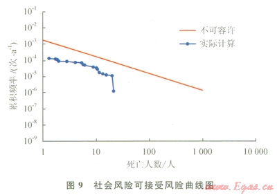 歐美等一些國家和石油天然氣企業(yè)已經(jīng)建立有自己的風(fēng)險可接受標(biāo)準(zhǔn)。我國于2011年國家安全生產(chǎn)監(jiān)督管理總局頒布了《危險化學(xué)品重大危險源監(jiān)督管理暫行規(guī)定》,制定了危險化學(xué)品重大危險源的風(fēng)險可接受標(biāo)準(zhǔn),除此以外沒有一個統(tǒng)一的或行業(yè)的風(fēng)險可接受標(biāo)準(zhǔn)。因此,筆者所在公司自2009年就開展了高含硫氣田開發(fā)風(fēng)險可接受標(biāo)準(zhǔn)的研究,并提出了公眾個人風(fēng)險標(biāo)準(zhǔn)(0.10-4),員工個人風(fēng)險(1.5×10-3)和社會風(fēng)險[1.10-3(N1),斜率取-1]基準(zhǔn)值以供參考。