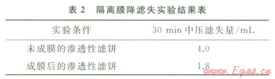 用水基鉆井液壓制成滲透性濾餅進(jìn)行清水滲透性實(shí)驗(yàn),評(píng)價(jià)防水滲膜防自由水滲透的效果。實(shí)驗(yàn)結(jié)果見表2。