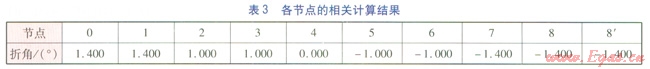 某直埋供熱管道規(guī)格為DN 1000mm,在敷設(shè)過程中遇到障礙物,要求在40m左右的距離內(nèi)偏移1m,之后管道需再調(diào)整回原管位。最大允許折角取1.4°,管段最短長(zhǎng)度限定為1m。管道布置方式見圖4。由于管道基本以障礙物(管段8—8¢所在位置)為中心成對(duì)稱布置,因此圖4僅給出一側(cè)的管道。各節(jié)點(diǎn)、各管段的相關(guān)計(jì)算結(jié)果分別見表3、4。為方便表述,定義管段向右側(cè)偏轉(zhuǎn)時(shí),折角為正值;向左側(cè)偏轉(zhuǎn)時(shí),折角為負(fù)值。