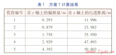 由表1、2可知,若實(shí)現(xiàn)0.879m的y軸上的偏移量,方案2在x軸上僅行進(jìn)17.975m,而方案1需行進(jìn)23.982m。這說(shuō)明,采取縮短管段長(zhǎng)度的方法,有利于在較短的行進(jìn)距離內(nèi)實(shí)現(xiàn)較大的偏移量,從而順利避開障礙物。需要指出的是:在實(shí)際工程中,我們可以采取多實(shí)際折角與多管段長(zhǎng)度相結(jié)合的處理方法,但焊縫數(shù)量不宜過多,以影響施工質(zhì)量。不應(yīng)出現(xiàn)避讓開障礙物后,管道調(diào)整回原管位時(shí)出現(xiàn)實(shí)際折角大于最大允許折角的情況。
