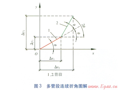 式中Dx2——管段2折角后管段在x軸上的行進(jìn)距離,m