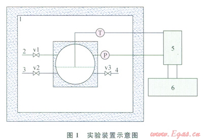 圖1為實(shí)驗(yàn)裝置示意圖,實(shí)驗(yàn)裝置主要部分包括可視化高壓反應(yīng)釜、恒溫空氣浴、真空系統(tǒng)、溫度傳感器、壓力傳感器、數(shù)據(jù)采集系統(tǒng)??梢暬邏悍磻?yīng)釜為反應(yīng)系統(tǒng)的核心部分,釜體材料為不銹鋼,兩端帶有玻璃視窗,可觀察水合物的靜態(tài)生成情況;恒溫空氣浴由制冷機(jī)提供冷量,可控溫度范圍為-20~40℃,穩(wěn)定運(yùn)行時(shí)控溫精度為±0.1℃;真空系統(tǒng)采用2XZ-0.5型旋片真空泵(浙江黃巖黎明實(shí)業(yè)有限公司)來實(shí)現(xiàn),可以將反應(yīng)釜抽真空至0.06Pa;溫度傳感器為Ptl00四線制鉑電阻溫度傳感器(北京賽億凌科技有限公司生產(chǎn)),精度為±0.1℃,置于反應(yīng)釜內(nèi)兩相分界面處,用來測(cè)量水合反應(yīng)過程中的溫度;壓力傳感器(上海天沐自動(dòng)化儀表有限公司生產(chǎn))量程為0~1MPa,測(cè)量壓力精度為0.05%;數(shù)據(jù)采集系統(tǒng)通過安捷倫數(shù)據(jù)采集儀Agilent 34970A來實(shí)現(xiàn)。