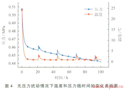 圖4、5分別表示在無壓力擾動(dòng)和有壓力擾動(dòng)下,靜態(tài)純水體系中C3H8水合物生成過程中溫度和壓力隨時(shí)間的變化曲線。溫度曲線表示C3H8水合物生成過程中溫度隨時(shí)間變化的曲線,而壓力曲線表示水合物生成過程中體系壓力隨時(shí)間變化的曲線。
