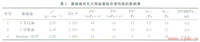使用3號白油、0號柴油和氣質(zhì)油Saraline 185V作為體系的基礎(chǔ)油,測試了不同基礎(chǔ)油配制的無土相油基鉆井液性能,試驗結(jié)果見表1所示。
