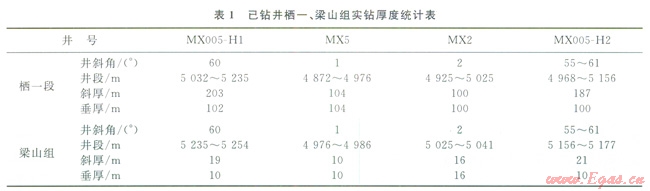MX5MX2井為直井,梁山組厚度分別為10m、16mMX005-H1為大斜度水平井,梁山組井斜60°,斜厚l9m,折算垂厚10m。設(shè)計(jì)的MX005-H2井棲一段、梁山組垂厚分別為100m、10m。設(shè)計(jì)以55°61°井斜角鉆開(kāi)石炭系,斜厚分別折算為187m21m(1)。