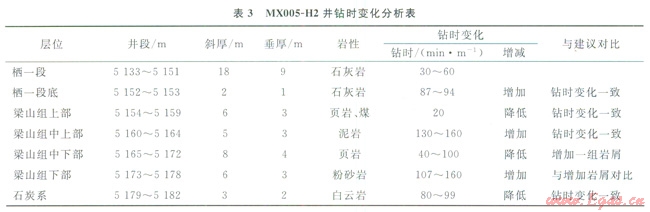 1)根據(jù)MX005-H1MX5、MX2井實(shí)鉆的巖屑、鉆時(shí)資料提出了梁山組利用鉆時(shí)變化特點(diǎn)輔助卡層建議。MX005-H2井現(xiàn)場(chǎng)應(yīng)用梁山組井斜角64°,實(shí)鉆鉆井液密度1.83gcm3,該建議與實(shí)鉆情況基本一致。