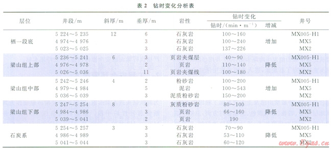 1)在棲一段中鉆進(jìn),一旦鉆時(shí)增加,就可能鉆到了棲一段底部,再鉆25 m,鉆時(shí)又降低,巖性由石灰?guī)r變?yōu)轫?yè)巖,部分井夾煤層(煤線),顏色變深、變黑,表明可能進(jìn)入了梁山組。