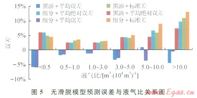 無滑脫模型各項誤差次之(圖4),組分模型計算誤差大于黑油模型,是由于Govier-Fogarasi用的凝析氣井液氣比為0.05~14.4m3/104m3,從黑油模型對所選模型(無滑脫、Gray和Hagedorn&Brown沒有劃分流型)計算流型看:Mukherjee&Brill和Orkiszewski所有井井簡全部為段塞流,Hasan&Kabir預(yù)測結(jié)果除5井次出現(xiàn)分散泡狀流以外,其余井全為環(huán)狀流。段塞流為一段氣一段液,而環(huán)狀流主要靠氣相中攜帶的液滴和氣相與管壁液膜的摩擦帶液。因此兩種流型的滑脫損失均較小,可以采用無滑脫模型計算壓降。從分段液氣比看,液氣比小于0.5m3/104m3,誤差較大,這主要是由于氣液比極高,舉升壓降極小,13口壓降梯度平均為1.74MPa/1000m,導(dǎo)致井底流壓(13口井底流壓平均13.4MPa)較小,即使計算的井底流壓誤差較小因井底流壓測壓值較小而誤差較大。隨著液氣比的增加,各項誤差逐漸增加(圖5)?,F(xiàn)考慮各項誤差限為5%,采用無滑脫模型的液氣比范圍為0.5~5m3/104m3,并對該氣液比條件下的產(chǎn)氣量進(jìn)行了分段統(tǒng)計如圖6所示,隨著產(chǎn)氣量的增加,各項誤差逐漸下降。因此無滑脫模型按黑油計算適用條件為:液氣比0.5~5m3/104m3,產(chǎn)氣量大于5×104m3/d,井底流壓誤差小于5%。