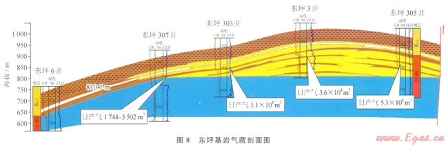 在流體識(shí)別、儲(chǔ)層參數(shù)計(jì)算、有效厚度確定的基礎(chǔ)上,通過(guò)多井對(duì)比,對(duì)氣藏有如下認(rèn)識(shí):基巖氣藏為雙重孔隙結(jié)構(gòu),氣藏內(nèi)部受裂縫發(fā)育,后期巖脈侵入等影響,縱向及平面上均表現(xiàn)出一定的非均質(zhì)性,北部的3井區(qū)和南部的l井區(qū)基巖段均為底水塊狀氣藏,基巖氣藏上部和側(cè)向與斷層下盤(pán)對(duì)接的地層為E1+2致密泥巖層及膏巖層,對(duì)厚層基巖氣藏起到了很好的封堵作用(圖8)。