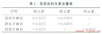 在巖心歸位的基礎(chǔ)上,利用不同巖性的數(shù)據(jù)點(diǎn)繪制中子密度交會(huì)圖,花崗片麻巖的樣本點(diǎn)落在砂巖線上或其上方,斜長(zhǎng)片麻巖的樣本點(diǎn)在白云巖線上,鈣質(zhì)片麻巖的樣本點(diǎn)在石灰?guī)r線和白云巖線之間。元素俘獲譜測(cè)井可以得到地層中主要的元素含量,可用于化學(xué)成分不同的變質(zhì)巖的區(qū)分[6]?;◢徠閹r的石英長(zhǎng)石含量高,暗色礦物含量低,因此元素俘獲譜上硅元素含量高,而鋁元素含量低;鈣質(zhì)片麻巖含有較多的碳酸鹽礦物,因此元素俘獲譜上鈣元素含量高、硅元素含量低;斜長(zhǎng)片麻巖含有較多的角閃石等暗色礦物,因此元素俘獲譜上硅元素含量相對(duì)低而鋁元素含量相對(duì)高,不同巖性的元素含量如表1所示。
