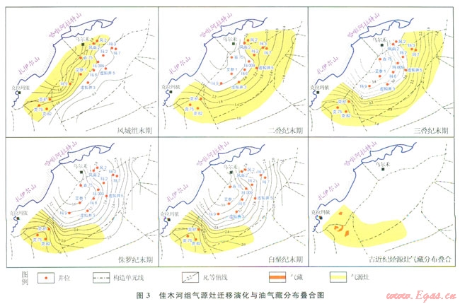 佳木河組氣源灶的演化歷史模擬結(jié)果表明,佳木河組氣源灶在風(fēng)城末期即開始出現(xiàn),但此時(shí)范圍較小,主要分布在瑪湖凹陷的西北斜坡部位;隨著地質(zhì)時(shí)間的推移,氣源灶的范圍不斷擴(kuò)大,位置也由瑪湖凹陷的中心向東南方向遷移。二疊紀(jì)末期,氣源灶范圍達(dá)到最大,之后由于部分地區(qū)烴源巖過成熟不再產(chǎn)氣而氣源灶范圍開始縮小。到現(xiàn)今,氣源灶的范圍主要分布在中拐區(qū)(3)。根據(jù)煤型氣(82)碳同位素值計(jì)算出天然氣R。值(R。2.17),與佳木河組下亞段烴源巖演化史對(duì)比分析發(fā)現(xiàn),天然氣應(yīng)當(dāng)是古近紀(jì)一現(xiàn)今的產(chǎn)物[13]。目前發(fā)現(xiàn)的煤型氣藏也主要分布在西北緣的中拐區(qū)[14-17],說明新近紀(jì)氣源灶控制了煤型氣藏的集中分布[18]