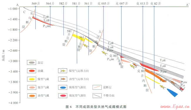 在區(qū)域向東傾斜的背景下,佳木河組頂部不整合面之的風(fēng)化黏土層構(gòu)成了有效封閉,其下的半風(fēng)化巖石是二疊系油氣重要的側(cè)向運(yùn)移通道。統(tǒng)計(jì)結(jié)果表明,距離不整合面越近,儲(chǔ)集層物性越好,有油氣顯示的層數(shù)越多。風(fēng)城組生成的油型氣一方面受自身烴源巖的封隔作用,另外一方面由于烴源巖的演化階段未完全進(jìn)入生氣階段,使得油型氣主要分布在風(fēng)城組尖滅線以內(nèi)。而佳木河組氣源巖生成的煤型氣大量沿著這套半風(fēng)化巖石發(fā)生長距離的側(cè)向運(yùn)移(6),大范圍分布在斜坡外緣。煤型氣與油型氣之間則分布了混源氣。輸導(dǎo)斷層相比遮擋型斷層,其發(fā)育規(guī)模更大,歷史上經(jīng)歷了多期活動(dòng),垂向上斷穿至白堊系,平面上主要分布于西北緣斜坡外環(huán)的克拉瑪依一烏夏斷裂、紅山嘴斷裂等,主要對(duì)早期生成并運(yùn)移至此的原油及油型氣起到縱向調(diào)節(jié)作用[21]