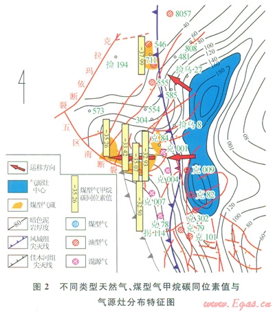 佳木河組干酪根碳同位素值很重,581井、514井和5949個(gè)樣品干酪根的碳同位素值為-21.96‰-20.29‰,有機(jī)質(zhì)類型以腐殖型干酪根為主。這套烴源巖成熟度較高,鏡質(zhì)體反射率為1.38%~1.90%,綜合評(píng)價(jià)為高成熟的較差氣源巖。依據(jù)沉積古地理推測在凹陷中泥巖的有機(jī)碳含量應(yīng)該更高。因此,佳木河組應(yīng)該是一套(且是研究區(qū)內(nèi)唯一一套)具有一定有機(jī)質(zhì)豐度、演化程度較高、具有生氣能力的烴源巖。加之煤型氣與其碳同位素值相近,并且同一來源天然氣的順層運(yùn)移會(huì)造成碳同位素分餾,以煤型氣為主的天然氣甲烷碳同位素值在該區(qū)區(qū)域性斜坡的背景上,呈現(xiàn)出自佳木河組氣源中心向氣藏方向逐漸變輕的趨勢(2),指示了天然氣白東向西的運(yùn)移方向。油型氣來源已有大量研究[12],皆表明其與原油同源,主要來自于風(fēng)城組烴源巖。