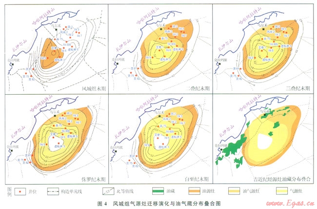 隨著地質(zhì)時(shí)的推移,烴源灶范圍不斷擴(kuò)大,中心位置也逐漸由油源灶向氣源灶轉(zhuǎn)化。至今,大部分地區(qū)仍在供烴,靠近凹陷邊緣位置的烴源灶以生油為主,靠近凹陷中心位置的烴源灶以生氣為主,凹陷中心由于演化程度過高而不再生成油氣。這樣的烴源灶分布形成了油型氣與原油相伴生、油氣圍繞風(fēng)城組尖滅線環(huán)帶狀分布的特征。