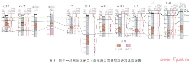 對(duì)川東、川中地區(qū)鉆揭中二疊統(tǒng)鉆井的鉆錄井資料重新梳理,系統(tǒng)研究巖心、巖屑、電測(cè)資料,并對(duì)中二疊統(tǒng)野外露頭剖面(華鎣山二崖剖面、西天剖面、李子埡剖面,豐都暨龍鎮(zhèn)烏羊壩剖面、放牛壩剖面,豐都武平大壩剖面)進(jìn)行仔細(xì)觀測(cè),筆者發(fā)現(xiàn)[2],川東中局部地區(qū)中二疊統(tǒng)茅口組茅二a亞段內(nèi)發(fā)育一套最厚為30m的白云巖、硅質(zhì)白云巖儲(chǔ)層(1)。