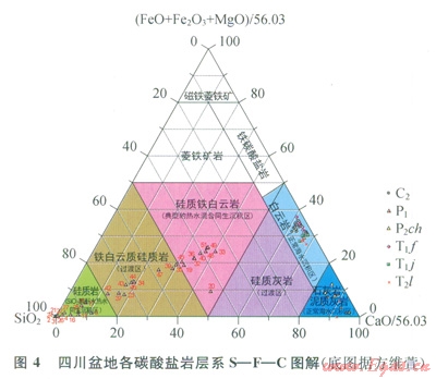 方維萱[7]提出SF—C圖解。C端元(CaO)代表正常海水的沉積作用形成的碳酸鹽巖,S端元(SiO2)代表以SiO2為酸酐的熱水同生沉積作用形成的硅質(zhì)巖,F端元(FeO+Fe2O3+MgO)代表富Fe、Mg碳酸鹽型熱水同生沉積作用形成的菱鐵礦巖。川東地區(qū)所有中二疊統(tǒng)層狀硅質(zhì)巖、硅質(zhì)白云巖、白云巖樣品均落在硅質(zhì)鐵白云巖(典型的熱水混合同生沉積區(qū))、硅質(zhì)巖(SiO2酸酐型熱水同生沉積區(qū))及鐵白云質(zhì)硅質(zhì)巖(過(guò)渡區(qū))內(nèi),而四川盆地石炭系、長(zhǎng)興組、飛仙關(guān)組、嘉陵江組和雷口坡組的樣品則落在正常海水沉積區(qū)(4)。S—F—C圖解顯示中二疊統(tǒng)層狀硅質(zhì)巖、白云巖、硅質(zhì)白云巖成因與其他層系的白云巖成因截然不同,為熱水成因。