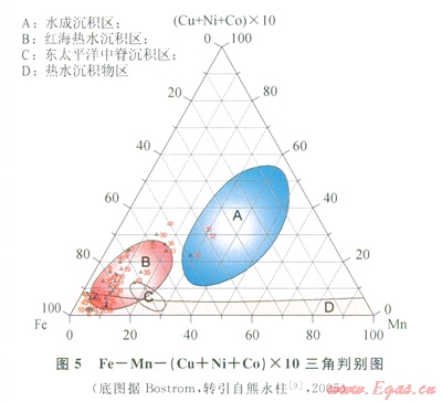 Bostrom提出熱水沉積物與正常水成沉積物的元素組成在FeMn(Cu+Ni+Co)×10的三角判別圖上有明顯的集中區(qū)(5)。川東地區(qū)中二疊統(tǒng)層狀硅質(zhì)巖、茅二a亞段白云巖大部分樣品落在B區(qū)紅海熱水沉積區(qū)和D區(qū)熱水沉積物區(qū),表明其主要為熱水成因沉積物。