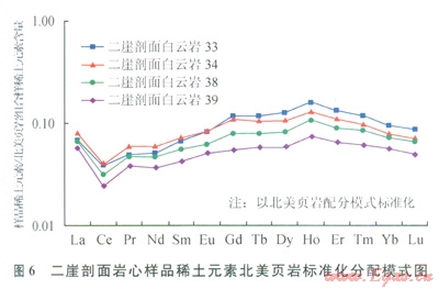 稀土元素能有效區(qū)分熱水成因沉積物與非熱水水成沉積的沉積物,前者REE總量低,Ce為負(fù)異常,Eu為正異常,HREE富集;后者REE含量高,Eu為負(fù)異?;驘o(wú)異常,HREE不富集[9-12]。川東地區(qū)多條野外露頭剖面(華鎣山二崖、華鎣山閻王溝、華鎣山仙鶴洞、石柱冷水溪)和鉆井巖心樣品白云巖(6,以華鎣山二崖剖面為例)的稀土元素北美頁(yè)巖標(biāo)準(zhǔn)化分配模式均可以看出,其沉積以熱水沉積為主,混有少量非熱水的水成沉積物。
