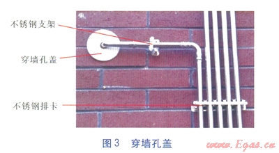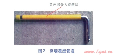 為避免填充材料對穿墻薄壁不銹鋼管的腐蝕,穿墻部分管道一般用防腐粘膠帶進(jìn)行纏裹,但此工序耗時(shí)且質(zhì)量受施工工人人為因素影響較大。在試點(diǎn)工作中特委托產(chǎn)品供應(yīng)商對穿墻部分直管段進(jìn)行覆塑處理,并以成品管件形式提供(見圖2)。