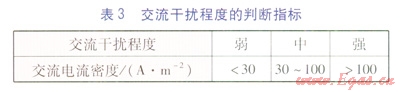 GBT 506982011《埋地鋼質(zhì)管道交流干擾防護(hù)技術(shù)標(biāo)準(zhǔn)》中第305條規(guī)定:當(dāng)管道上的交流干擾電壓不高于4V時(shí),可不采取交流干擾防護(hù)措施;高于4V時(shí),應(yīng)采用交流電流密度進(jìn)行評(píng)估。高于4V時(shí)的交流干擾程度的判斷指標(biāo)參照GBT 506982011《埋地鋼質(zhì)管道交流干擾防護(hù)技術(shù)標(biāo)準(zhǔn)》中306(見(jiàn)表3)。