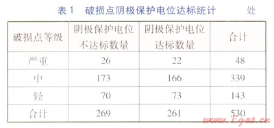 測(cè)得530處防腐層破損點(diǎn)管道電位分布情況是:261處防腐層破損點(diǎn)極化電位為-950-850mV,達(dá)到最小保護(hù)電位要求(-850mV),破損點(diǎn)陰極保護(hù)電位達(dá)標(biāo)統(tǒng)計(jì)見(jiàn)表1。