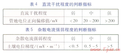 SYT 00172006《埋地鋼質(zhì)管道直流排流保護(hù)技術(shù)標(biāo)準(zhǔn)》中第301條規(guī)定:處于直流電氣化鐵路、陰極保護(hù)系統(tǒng)及其他直流干擾源附近的管道,應(yīng)進(jìn)行干擾源側(cè)和管道側(cè)兩方面的調(diào)查測(cè)試。當(dāng)管道任意點(diǎn)上的管地電位較自然電位偏移20mV或管道附近土壤電位梯度大于0.5mVm時(shí),確認(rèn)為直流干擾。”第302條規(guī)定,管道直流干擾程度一般按管地電位較自然電位正向偏移值按表4所列指標(biāo)判定;當(dāng)管地電位較自然電位正向偏移值難以測(cè)取時(shí),可采用土壤電位梯度按表5所列指標(biāo)來(lái)判斷雜散電流的強(qiáng)弱程度。