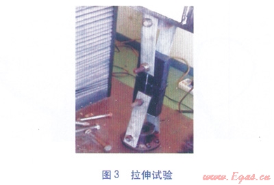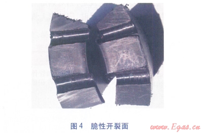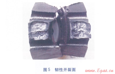 2中,耐壓(靜液壓)強(qiáng)度試驗(yàn)合格,即焊接處無破壞,無滲漏;拉伸性能試驗(yàn)不合格,指焊接接頭破壞類型為脆性開裂(見圖4);拉伸性能試驗(yàn)合格,則焊接接頭破壞類型為韌性開裂(見圖5)。