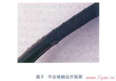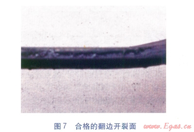 合格的判定:翻邊不開裂,或者即使開裂,開裂面是韌性開裂面(見圖7),判定為合格;翻邊發(fā)生開裂,并且開裂面是光滑平整的脆性開裂面(見圖8),判定為不合格。對于判定不合格的接頭需割除接頭重新焊接,如果不合格的數(shù)量較多,但翻邊脆性開裂長度小于25%,則應(yīng)該通過選取典型試件做拉伸性能試驗(yàn)來最終確定該類焊接接頭是否合格。
