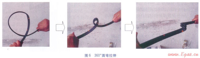 工程實(shí)踐中,我們通過與材料制造及熱熔連接設(shè)備廠家技術(shù)人員進(jìn)行交流,發(fā)現(xiàn)采用360°的面彎并拉伸的方法(見圖6),可以將有質(zhì)量問題的翻邊檢驗(yàn)出來。這種方法在最后拉伸時(shí)會(huì)在熔合面上形成很大的剪切力,比180°背彎更有效。