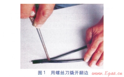 我單位于2012年敷設(shè)了一段DN 250mm聚乙烯燃?xì)夤艿?/span>(SDR11 PE100),依照規(guī)范的規(guī)定對某熱熔對接連接接頭質(zhì)量進(jìn)行了檢驗(yàn),在翻邊對稱性檢驗(yàn)和接頭對正性檢驗(yàn)均合格的前提下,對其進(jìn)行了翻邊切除檢驗(yàn),切削下來的翻邊條外觀檢驗(yàn)合格,翻邊背彎(每隔50mm進(jìn)行180°背彎)試驗(yàn)時(shí),亦未出現(xiàn)開裂、裂縫及熔合線裸露,該對接接頭質(zhì)量判定為合格。但偶然情況下,發(fā)現(xiàn)該檢驗(yàn)合格的翻邊,使用一字形螺絲刀可以在局部某一段沿熔合面撬開(見圖1),而且分開的熔合面光滑平整,我們推斷該接頭質(zhì)量不合格。于是,對所有已經(jīng)完成的且檢驗(yàn)合格的對接接頭翻邊進(jìn)行了加強(qiáng)檢查,包括一字形螺絲刀撬、最大限度的扭曲拉伸等,這樣又找到了多個(gè)同類問題的翻邊。由此,對規(guī)范規(guī)定的翻邊切除檢驗(yàn)方法能否有效證明熱熔對接連接接頭質(zhì)量合格提出了疑問。