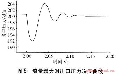 低壓腔體積分別為90、180、270、360和480cm3時(shí),在t=1.00s時(shí)刻突然減小閥門開度,流量突然減小,出口壓力的動(dòng)態(tài)響應(yīng)曲線見圖7??梢钥吹?,在一定范圍內(nèi),隨著低壓腔體積的增加,超調(diào)量逐漸減小,而對(duì)過渡時(shí)間的影響不大。