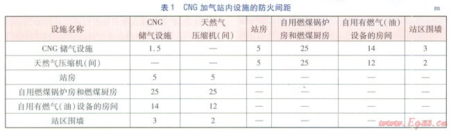 CNG加氣站站內(nèi)設備、照明等需要配電,配電大多為站房中的一個功能房。規(guī)范GB 5015620121229條規(guī)定,站房可由辦公室、值班室、營業(yè)室、控制室、變配電、衛(wèi)生和便利店等組成。”可把配電確定為站房的一部分。表1列出了站房、自用燃煤鍋爐房和燃煤廚房、自用有燃氣()設備的房間與其他站內(nèi)設施的防火距。表1明確表明:配電為不屬于自用燃煤鍋爐房和燃煤廚房、自用有燃氣()設備的房間等有特殊介質(zhì)的房,應按“站房”確定防火距。按照表1,CNG儲氣瓶組、CNG橇裝壓縮機與站房(含配電)的防火距為5m;CNG儲氣瓶組與圍墻的防火間距為3mCNG橇裝壓縮機與圍墻的防火間距為2m