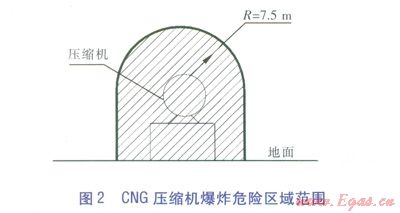 查看規(guī)范GB 501562012附錄C爆炸危險區(qū)域圖,露天設置的CNG儲氣瓶組、CNG壓縮機的爆炸危險區(qū)域范圍見圖1、2,圖中陰影部分表示爆炸危險區(qū)域(2區(qū))。
