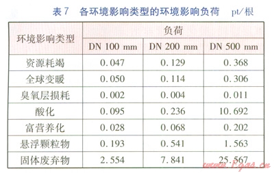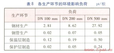 根據(jù)目標(biāo)距離法,可計(jì)算得到生產(chǎn)1根保溫管道的各環(huán)境影響類型的環(huán)境影響負(fù)荷及各生產(chǎn)環(huán)節(jié)的環(huán)境影響負(fù)荷(分別見表7、8)。將環(huán)境影響負(fù)荷的單位定義為環(huán)境負(fù)荷點(diǎn)(Point,簡(jiǎn)寫為pt)。由于DN 500mm鋼管采用螺旋焊鋼管,能耗較低,因此環(huán)境影響負(fù)荷反而低于采用無(wú)縫鋼管(自動(dòng)軋管)DN 200mm鋼管。
