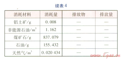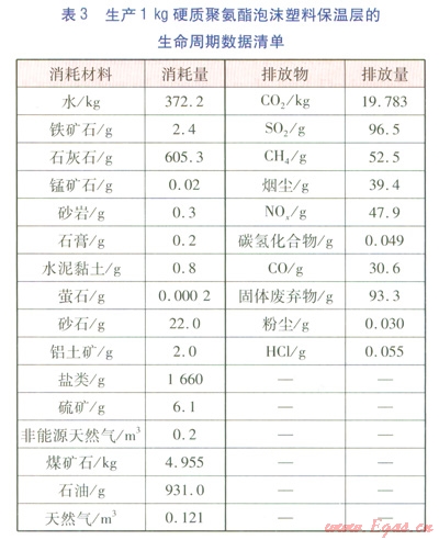 建材的含能(Embodied Energy)近年來(lái)在國(guó)外得到廣泛研究,含能是指產(chǎn)品從自然界原始材料的掘取,經(jīng)過運(yùn)輸、加工、組裝直至成品出廠前的所有相關(guān)過程的能耗總和,是基于生命周期的能耗統(tǒng)計(jì)數(shù)據(jù)。顧道金[14]利用國(guó)外含能數(shù)據(jù),建立中國(guó)建筑產(chǎn)品外推含能數(shù)據(jù)表,并計(jì)算了我國(guó)能源使用背景下lMJ含能的生命周期數(shù)據(jù)清單。對(duì)于保溫層、外護(hù)管,在計(jì)算環(huán)境影響時(shí)都采用此種方法,生產(chǎn)1kg硬質(zhì)聚氨酯泡沫塑料保溫層、高密度聚乙烯外護(hù)管的生命周期數(shù)據(jù)清單(關(guān)鍵數(shù)據(jù))分別見表34。