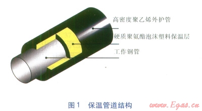 評(píng)價(jià)對(duì)象是以硬質(zhì)聚氨酯泡沫塑料作為保溫層,高密度聚乙烯作為外護(hù)管的保溫管道,具體結(jié)構(gòu)見圖1。選取規(guī)格為DN 100、200、500mm保溫管道進(jìn)行評(píng)價(jià),工作鋼管長(zhǎng)度均為12m。保溫管道各種技術(shù)參數(shù)執(zhí)行CJT 1142000《高密度聚乙烯外護(hù)管聚氨酯泡沫塑料預(yù)制直埋保溫管》,3種規(guī)格保溫管道的具體技術(shù)參數(shù)見表1。