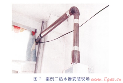 事故燃氣熱水器排氣管安裝不符合GB 6932—2001《家用燃氣快速熱水器》附錄A《家用燃氣快速熱水器安裝技術要求》A413中防倒風罩以上的排氣管室內(nèi)垂直部分不得小于250mm以及排氣管頂端必須安裝有效的防風、雨、雪的風帽的要求。此種情況下,極易出現(xiàn)在使用熱水器時,由于煙道排氣不暢,甚至出現(xiàn)倒風,致使燃氣燃燒產(chǎn)生的煙氣不能有效排到室外。