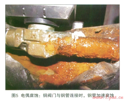 在金屬活動順序表中,Fe要比Cu活潑,在相同的環(huán)境中,Fe的電位要比Cu負。當異種金屬相接觸,處于相互連通的電解質中時,由于不同金屬之間存在實際電位差而使電位較低的金屬腐蝕速度比原來增大,電位較高的金屬的腐蝕速度減小,這種現(xiàn)象稱為電偶腐蝕[4],見圖5所示。當鋼與銅相互接觸時,鋼的腐蝕速率比其單獨存在時加大。在閥門位置,利用銅包鋼或者銅網進行接地時,由于電偶腐蝕的作用,會加速閥門的腐蝕。同時由于銅的良好導電性和自腐蝕較低的特性,利用銅材質進行接地時,接觸電阻要比閥門直接接地更低,在這種情況下,陰極保護電流集中流入流出的現(xiàn)象會更加嚴重。