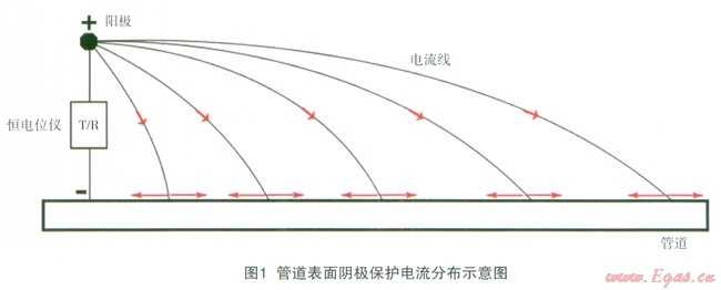陰極保護系統(tǒng)電路路徑的構成包括:土壤、管道、導線[2]。對于直流電路來說,根據歐姆定律可以知道,電路中的電流在流動過程中,電流會始終傾向于在電阻較小的路徑流動。當管道的防腐層面電阻率變化不大、防腐層沒有出現(xiàn)嚴重的破損點和接地的情況時,管道表面陰極保護電流的分布是相對較為均勻的,如圖1所示。
