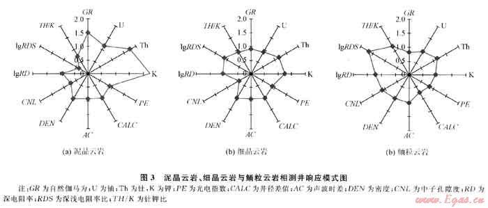 由于取心資料有限,要深入研究巖相特征,需要利用測井資料來實現(xiàn)。其基本原理主要是:不同沉積環(huán)境形成的巖石類別,其礦物成分、結(jié)構(gòu)、構(gòu)造等存在差異,導致地球物理屬性的差異,可在各種測井系列上出現(xiàn)差別響應,因而可根據(jù)各種測井信息的集總,建立各類巖相測井響應歸一化模式庫(圖3)[3]。